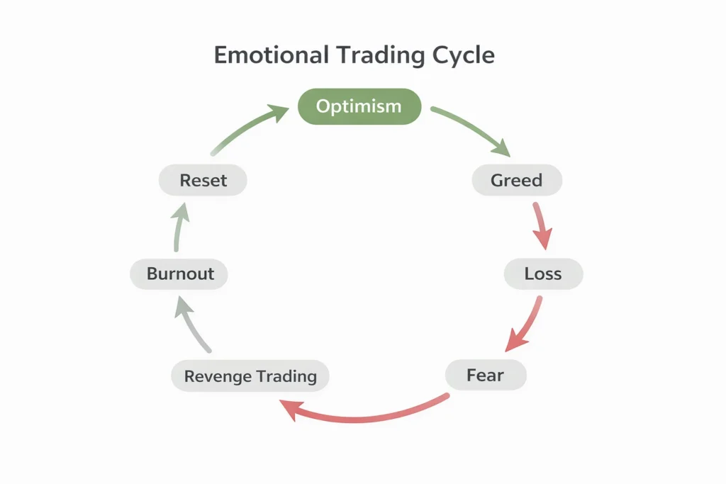 Purpose: This diagram should visually illustrate the repeating emotional loop many traders experience: optimism → greed → loss → fear → revenge trading → burnout → reset. It helps readers understand how emotional responses reinforce rule-breaking behavior.